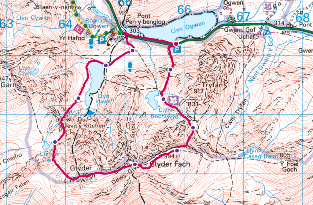 There’s plenty of choice along the A5 but the closest to the start is just a little further on from the main Llyn Ogwen Cafe Car Park . Use LL57 3LZ. If it’s busy don’t park illegally as your car will get towed, just accept you’ll need to walk a bit or get on the park and ride.