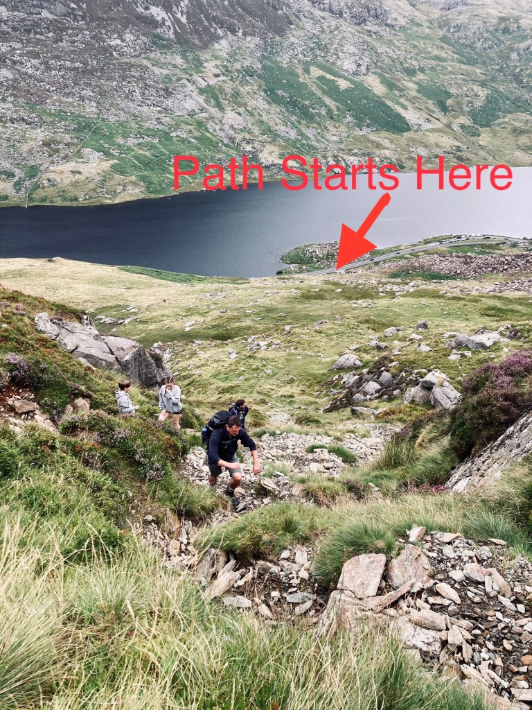 From the car park pic above you can see the path starts very clearly winding zig zag up to the right side of Tryfan.