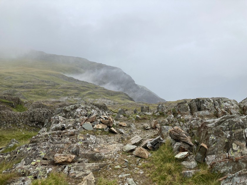 There is a small lake/tarn that you can see as you make your way down but just before you get to it you take a right fork in the path to head to the stone wall at the top of the Devil’s Kitchen descent.