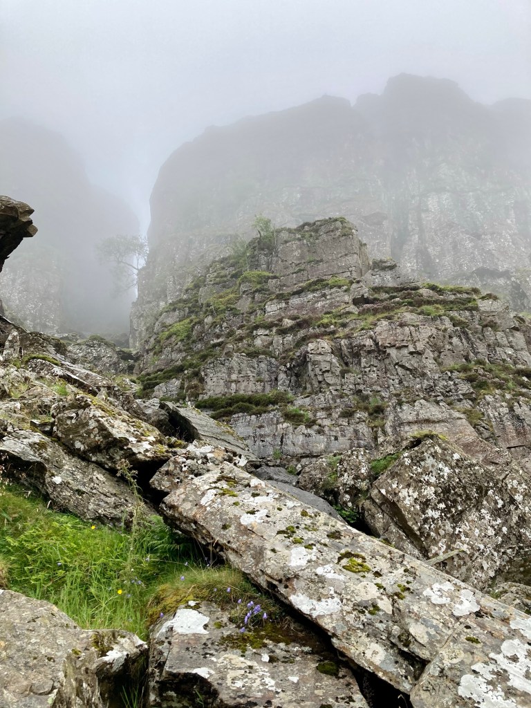 Twll Du is the Welsh name for Devil’s Kitchen it means ‘black hole’ which is very apt as from a distance the black crack is very obvious. The English name, Devil’s Kitchen comes from the plume of ‘steam’ that is often seen rising from the crack and looks like a chimney, or the Devil cooking as you could easily imagine that he might choose to live in a dank, black hole like this. Up close it’s actually rather beautiful with water dripping through.
