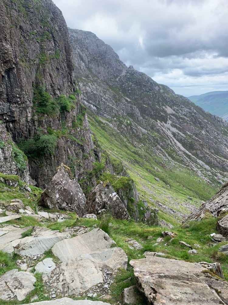 From here the descent begins, the path is quite clear and on the right of the ridge before it turns into very loose scree with a large zig-zag path that takes you to the col between Glyder Fach and Y Garn.