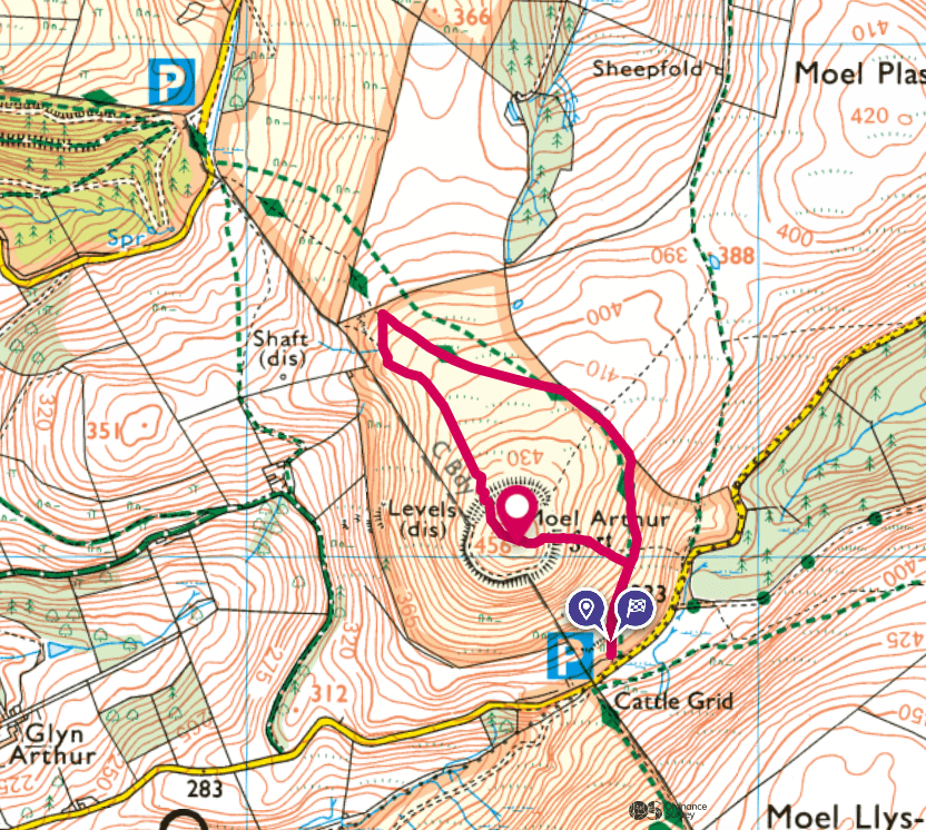 There is a small car park right at the bottom of Moel Arthur on the B5429 accessible from both directions. You could park on the other side of the hill. This creates a slightly longer walk to the top.