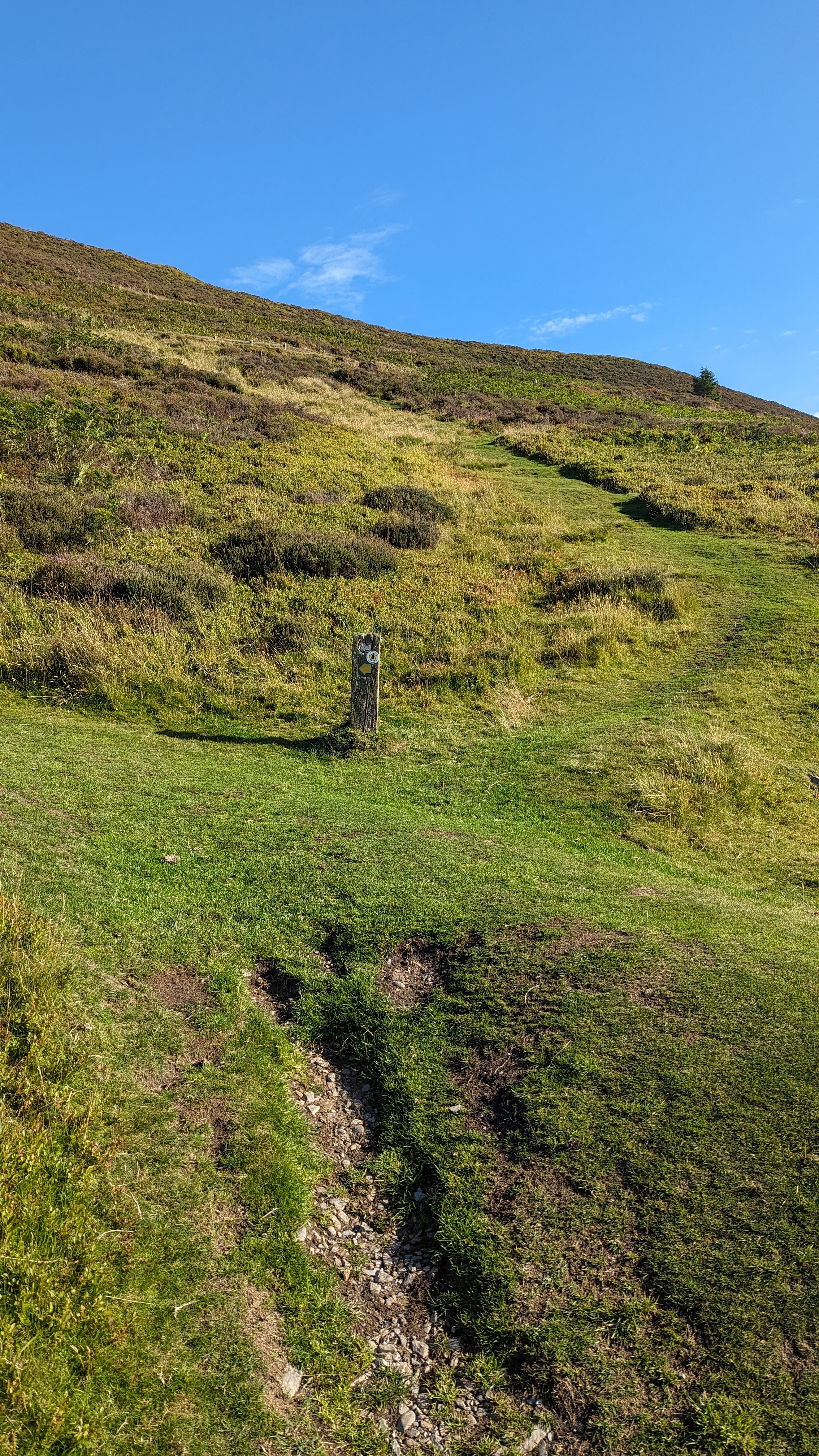 It’s a very straightforward walk up this pretty hill. Start from the road edge of the car park or if you have parked further in look for a large gate which leads you onto some grassland. There are lots of sheep, so dogs must be on the lead.