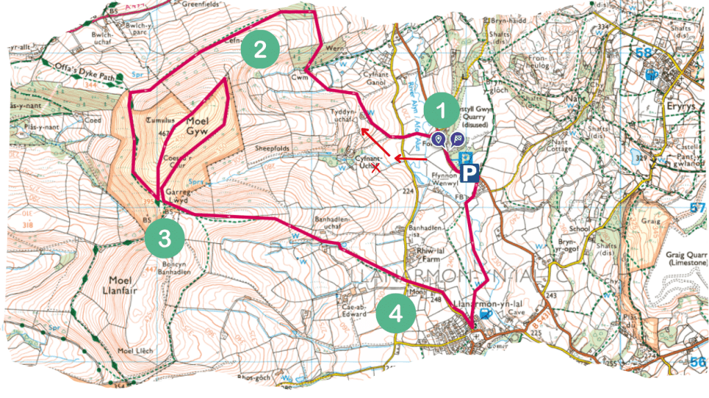 Parking is at Pistyll Gwyn Quarry, there is enough room for around 20 cars so it’s unlikely you’ll have a problem finding a space. I’ve also made a note of the start of the route with red arrows, the cross shows where I went wrong and ended up in a farm yard with a huge pig and some excited Turkeys staring at me and Ziggy – don’t make the same mistake!