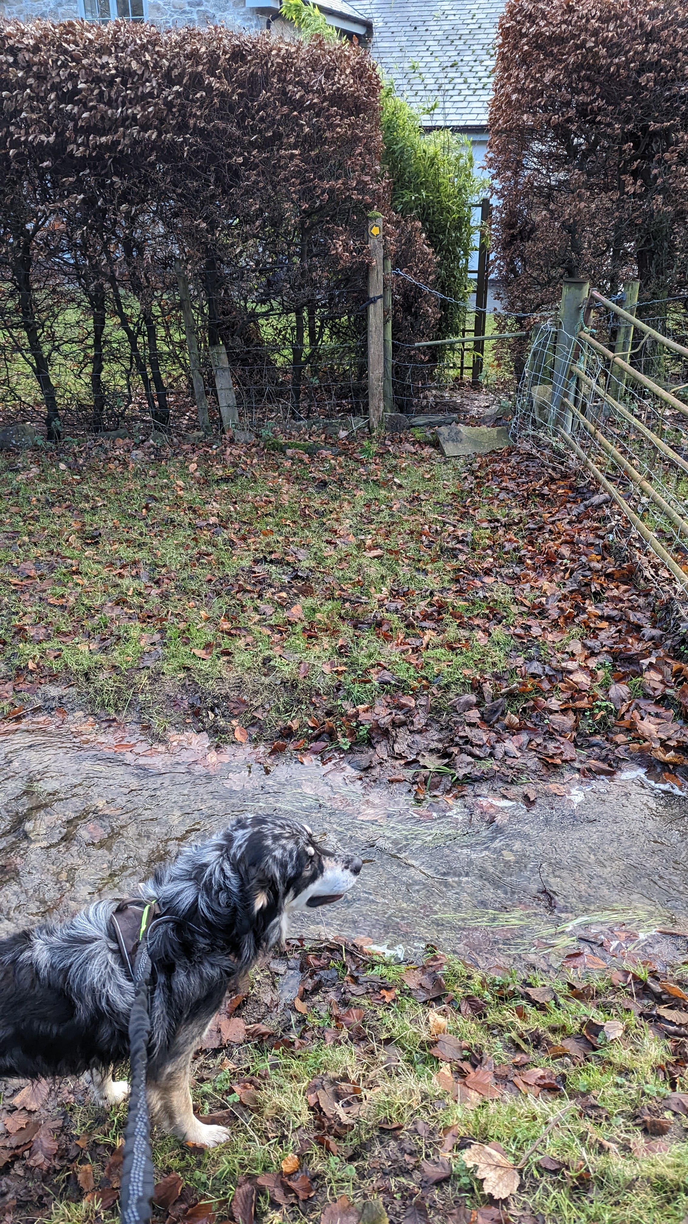 There’s a small yellow arrow on a post. Jump over the little stream and start heading left. It took me a little while to spot the sign as it felt like the path had turned into a stream, but other than being a little squelchy underfoot you are definitely on the right track. Keep walking, go past a rather swampy pond on the left until you reach a farm track.