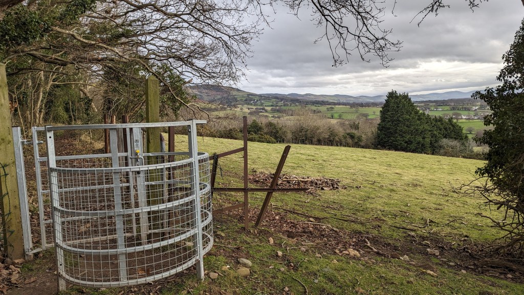 The Dinorben arms and the start of the walk up Moel Y Gaer. Start by walking through the beautiful lich gate of St Stephen’s, Bodfari. Continue up the tarmac path until you see a brick building with a metal gate to the left. Turn immediately right and head up through a sheep field to a swing gate.