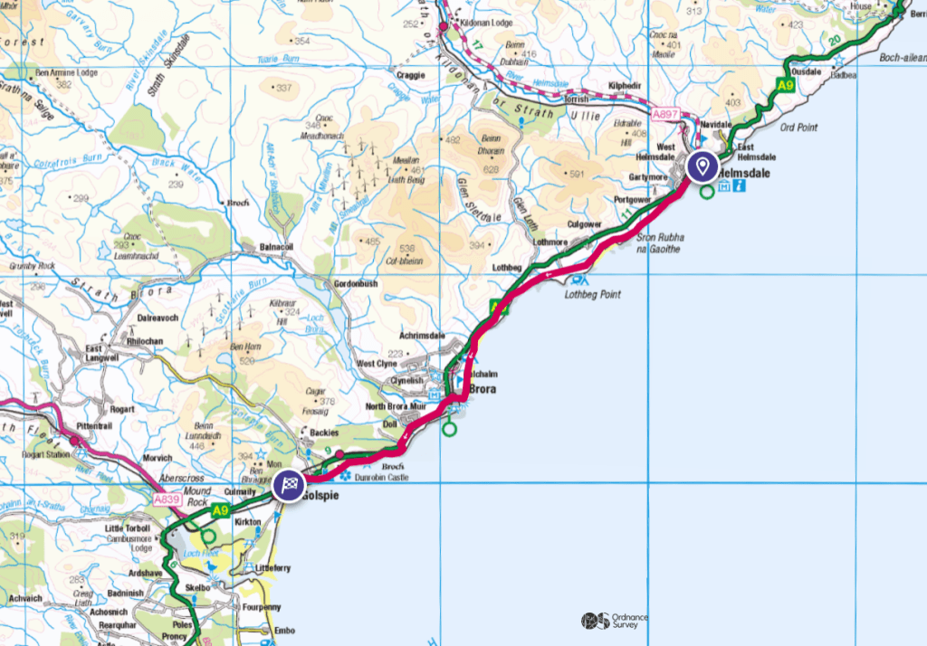 “Huna Inn” — Canisbay — Bucholie Castle — Keiss — Girnigoe — Sinclair — Noss Head — Wick — or ¶ Wick Harbour — Mid Clyth — Lybster — Dunbeath ¶ Berriedale — Braemore — Maidens Paps Mountain — Lord Galloway’s Hunting-box — Ord of Caithness — Helmsdale ¶ Loth — Brora — Dunrobin Castle — Golspie ¶ The Mound — Loch Buidhee — Bonar Bridge — Dornoch Firth — Half-way House [Aultnamain Inn] ¶ Novar — Cromarty Firth — Dingwall — Muir of Ord — Beauly — Bogroy Inn — Inverness ¶¶