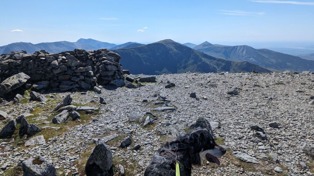 Carnedd Llywelyn Summit. The final summit of the Cwm Eigiau Horseshoe- Ziggy my coltriever relaxing at the top.