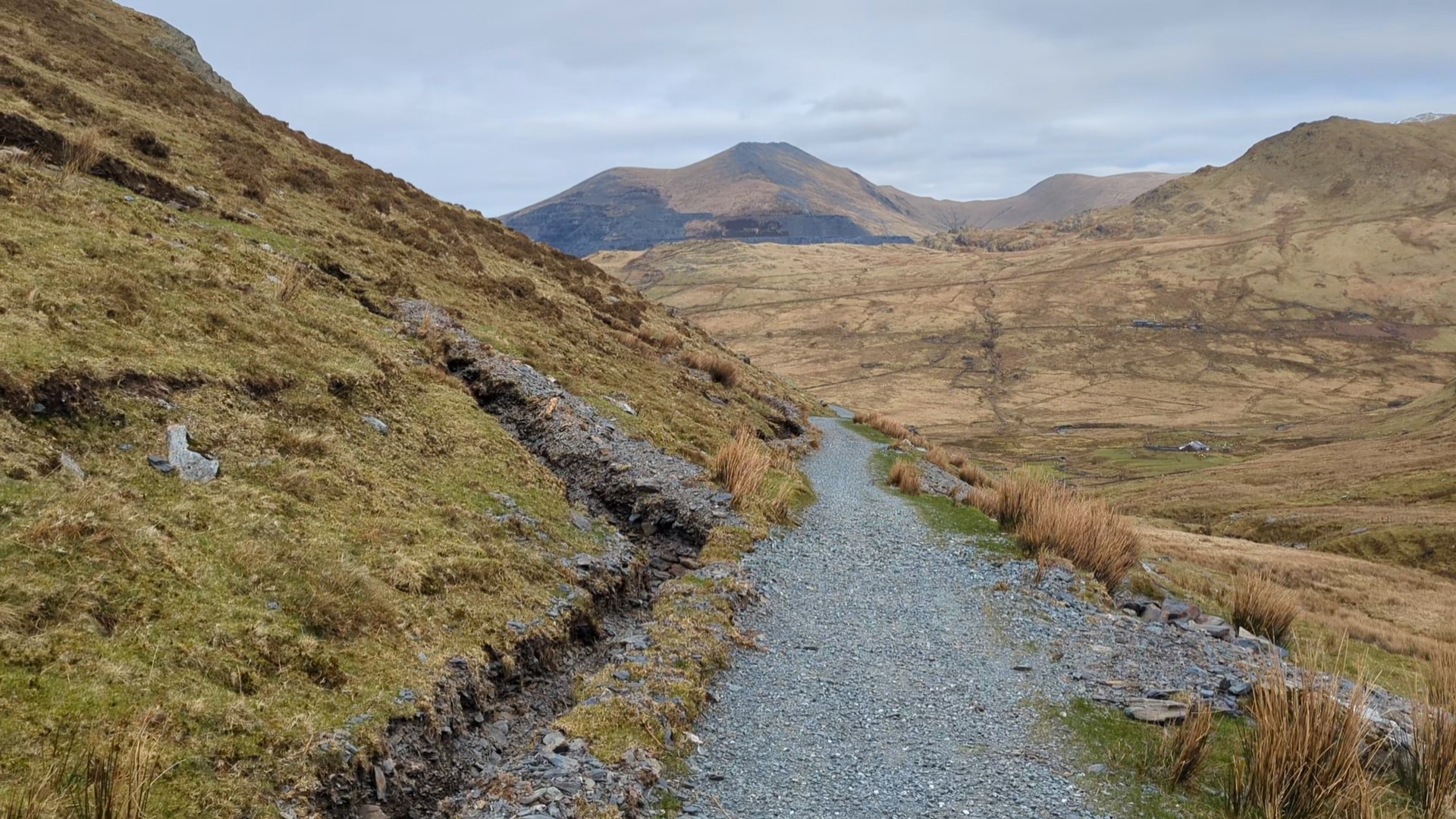 Turn right when you reach the Slate Trail and head to Bwlch-y-groes along this obvious track. You’ll cross the Afon Goch over a modern metal bridge.