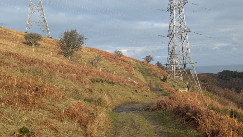 After passing through a gate near some pylons, look out carefully for a path leading uphill. This is easy to miss if you are not concentrating, but it is an important turning point on the route if you miss it and continue on you’ll carry on to the falls themselves.
